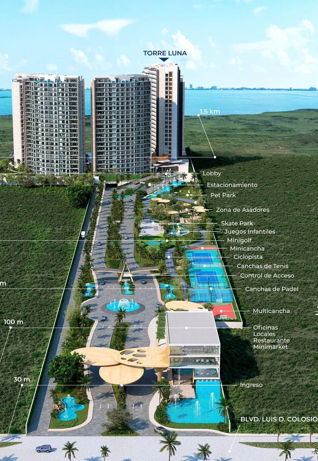 Inmejorable ubicación con acceso por Blvd. Luis D. Colosio a 5 minutos del centro de Cancún y a 10 minutos del aeropuerto, estacion del Tren Maya y zona hotelera.